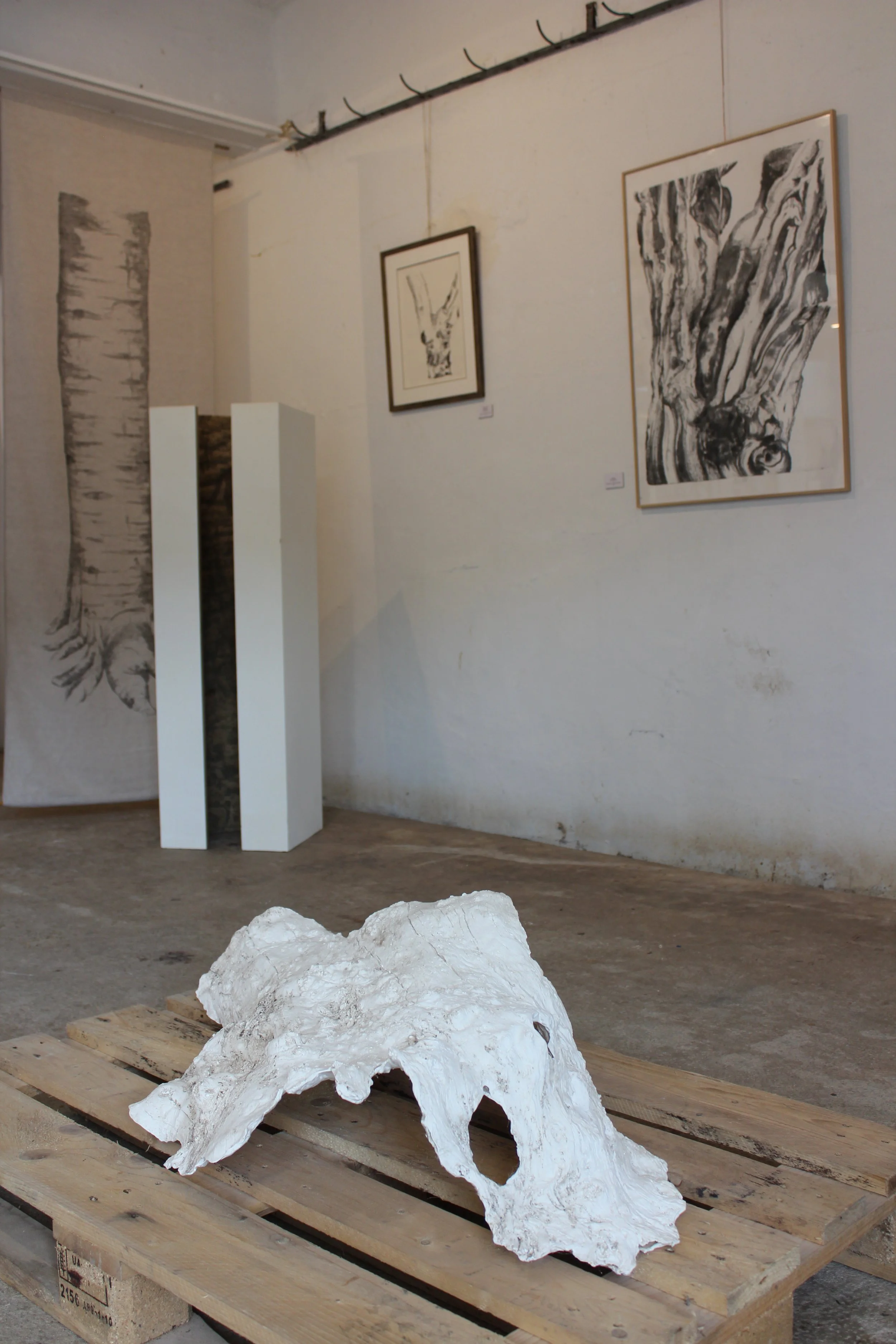 Salle Anne Follezou. Sculpture Ouvrir l’arbre Mélissandre Sampic, lithographies Mathilde Bodiguel.